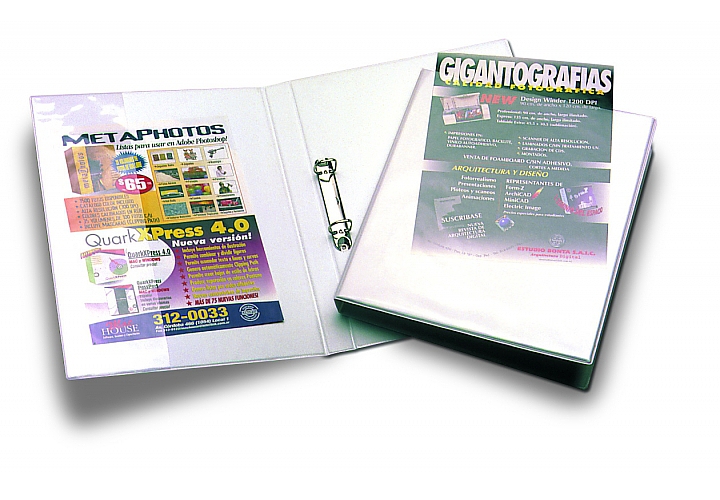 Carpeta de cartón rigido forrada en tela plastica. Frente y lomo con cobertura de cristal semi rigido de 180 micrones de espesor, tamaño oficio, dos anillos semicirculares, interior con bolsillo vertical, capacidad 23 mm. Medida: 27 x 36.5 cm