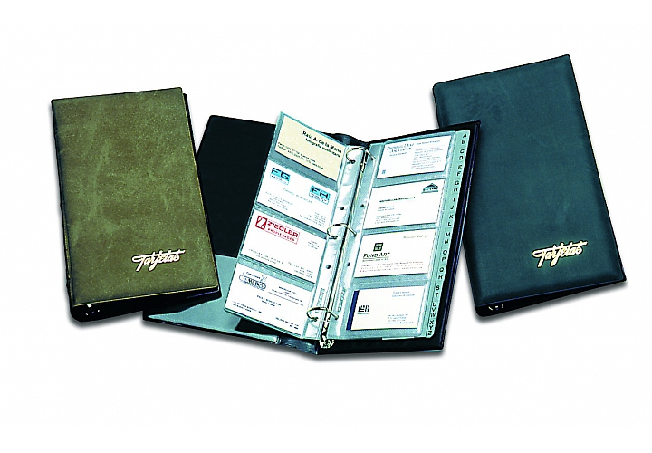 Tarjetero Clingsor 1100, 3 anillos, simil cuero capacidad 96 tarjetas. Tapas de cartón rIgido forrado en tela de goma, 12 folios moviles porta tarjetas y repuesto abecedario. Medida: 17 x 29.5 cm
