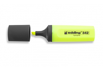 Resaltador Edding 342. Punta biselada. Cuerpo de plástico extra chato. Tinta pigmentada a base de agua. Recargable. Grosor de trazo aprox. 2 - 5 mm