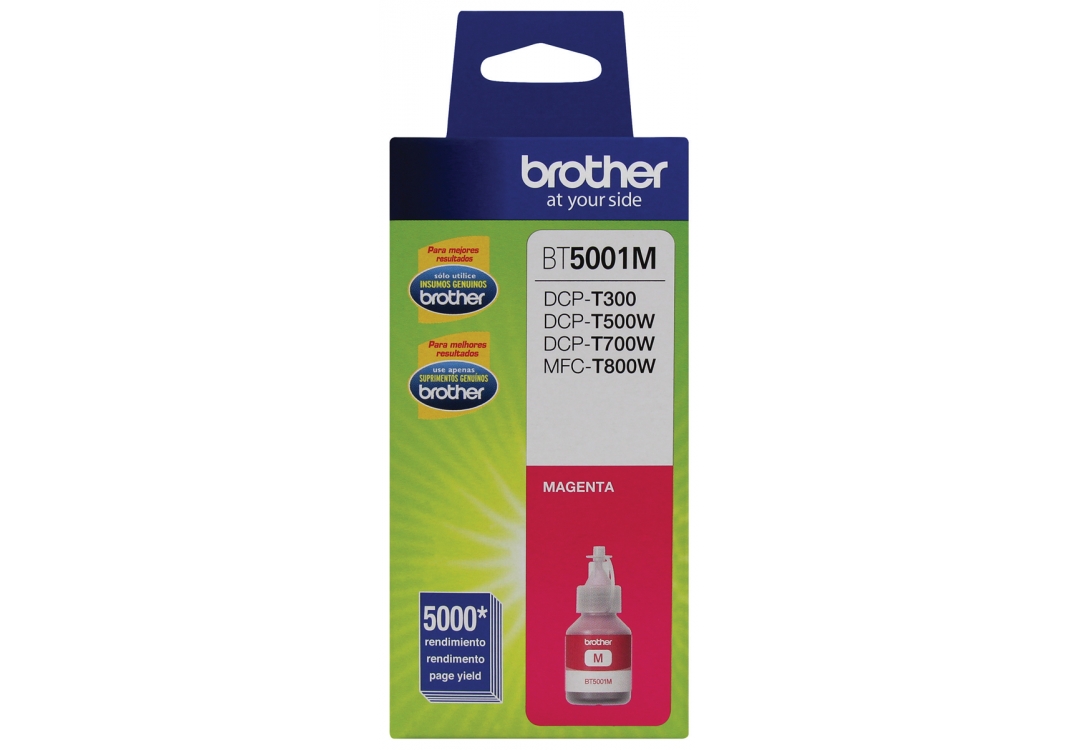 Botella de tinta Brother BT5001M magenta, compatible con DCP-T300, DCP-T500W, DCP-T700W, MFC-T800W, original. Rendimiento 5000 paginas aprox. Contenido 41.8 ml